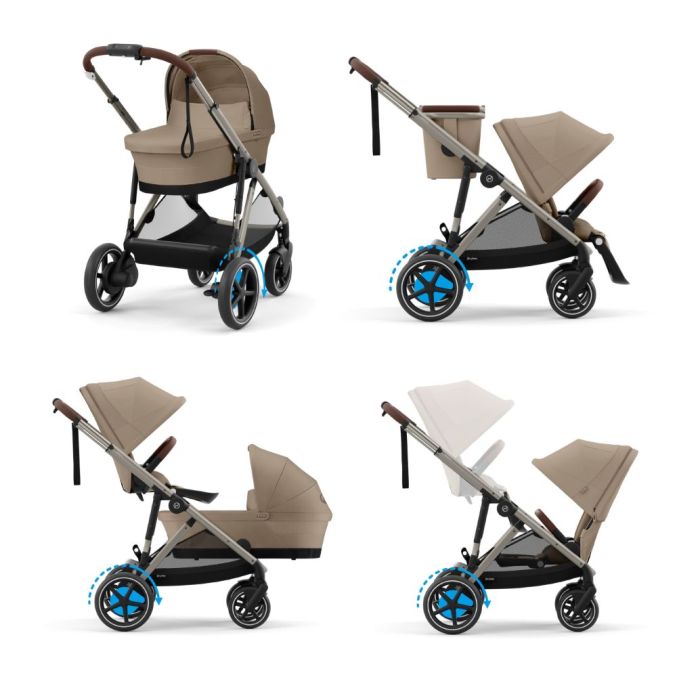 De Cybex e-Gazelle S kinderwagen kan eenvoudig worden omgebouwd van een enkele naar een dubbele kinderwagen zonder extra adapters. Voor gebruik als dubbele kinderwagen heb je een extra zitje nodig, en voor een tweelingkinderwagen zijn een extra reiswiegje en wandelwagenzitje vereist, die apart verkrijgbaar zijn. Daarnaast kun je ook een Cybex baby autostoel (apart verkrijgbaar) op het frame bevestigen. In totaal zijn er meer dan 20 verschillende configuraties mogelijk.